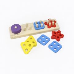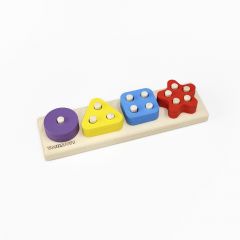 В фигурках разных форм есть разное количество отверстий и ребенок должен найти им правильные штырьки. При этом он учится сопоставлять формы, считать, различать и называть фигуры.