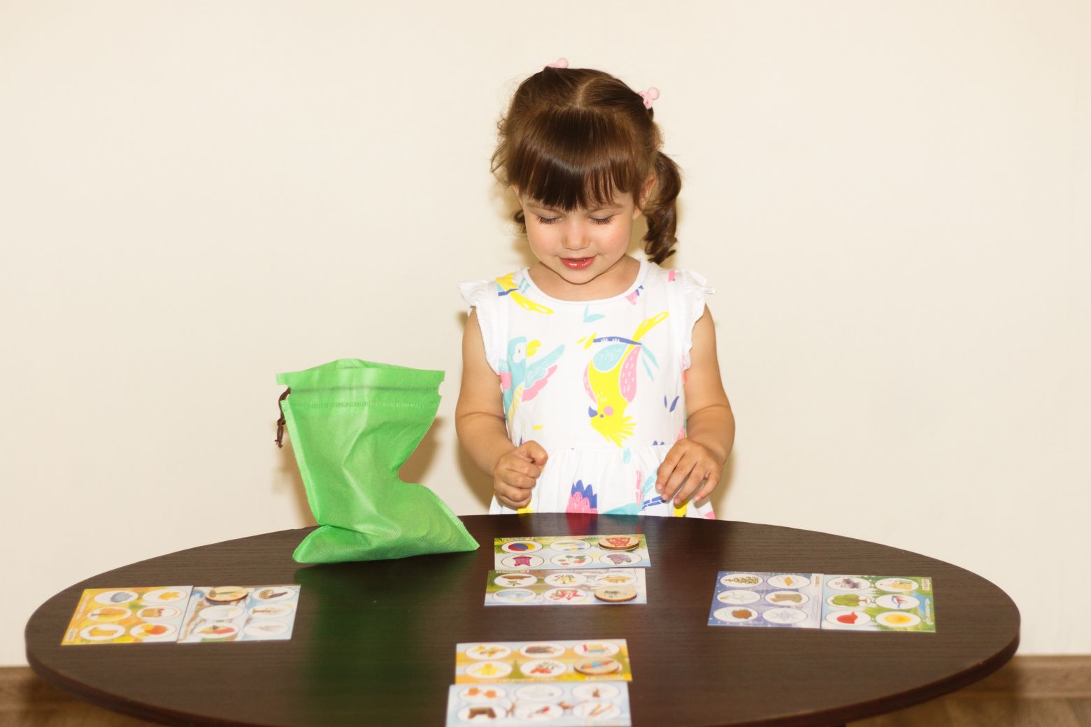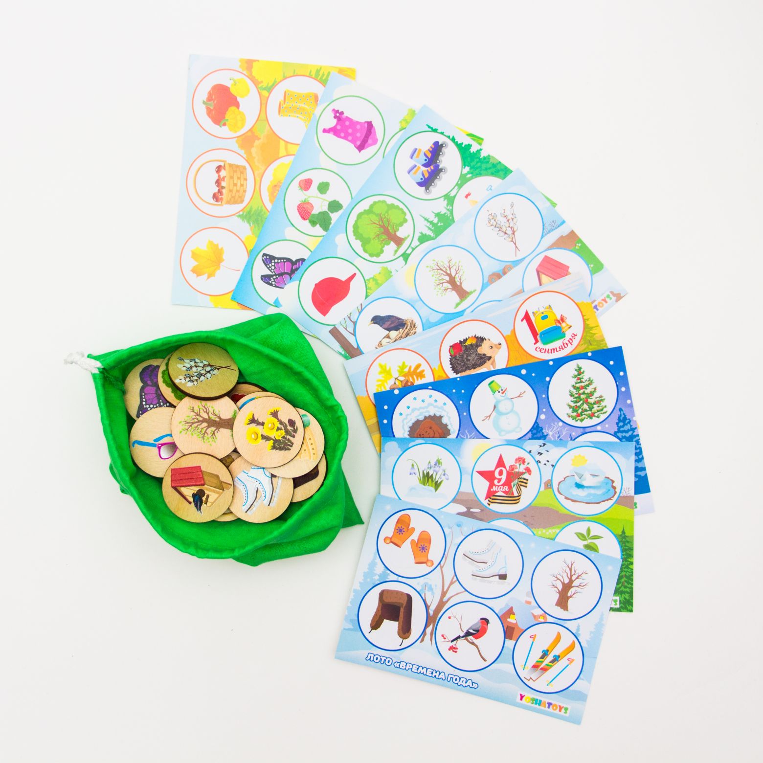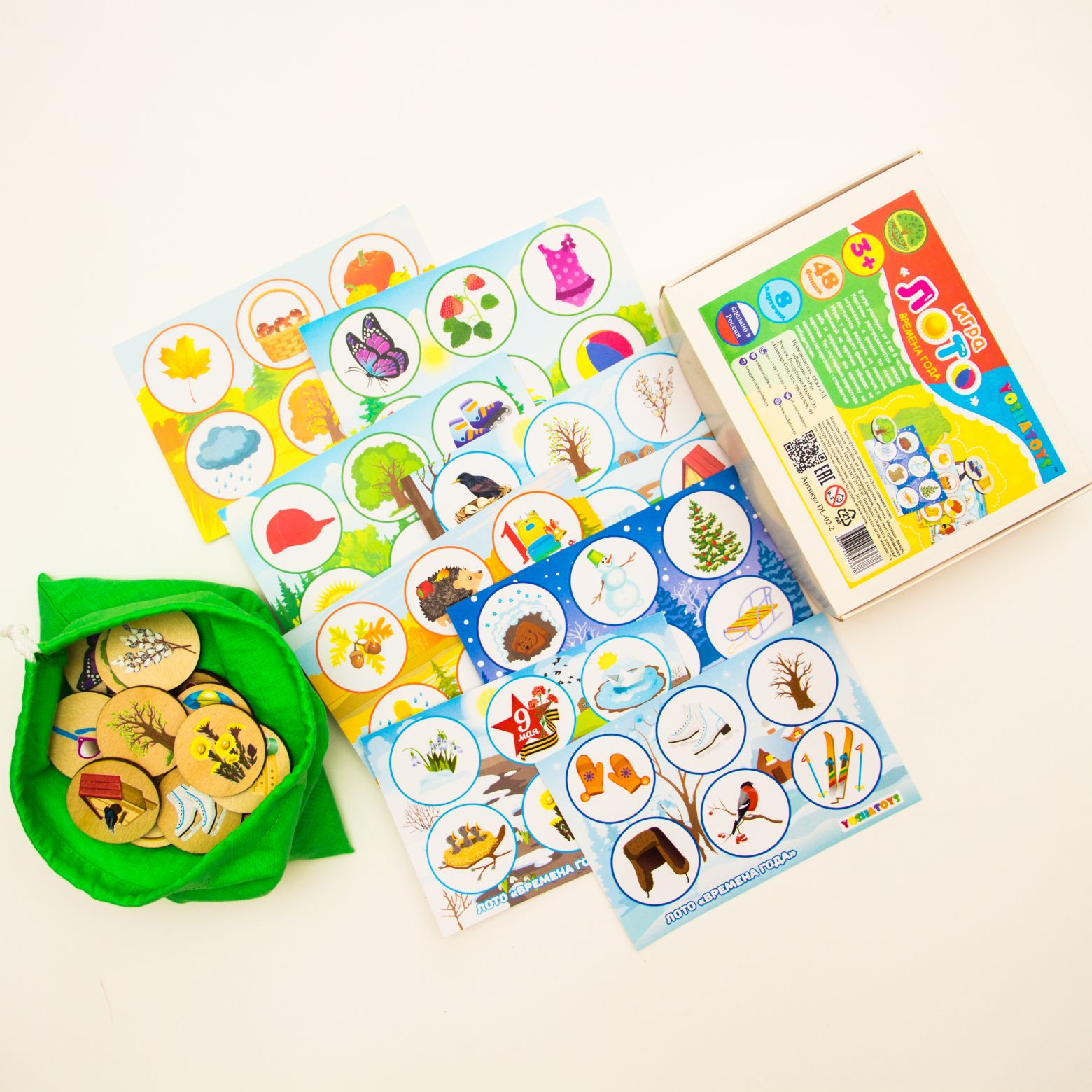 В наборе детское лото "Времена года" 8 карточек и 48 деревянных фишек с цветными изображениями соответствий временам года. Рисунки нанесены безопасным методом УФ печати, края закруглены. Правила лото для малышей очень просты: в игре участвует от 2 до 8 человек. Карточки распределяются между игроками, а фишки по одной достаются ведущим из мешочка. Игрок, у которого фишка совпала с картинкой на карточке забирает ее себе и закрывает ею картинку на карточке. Тот, кто первым закрыл все картинки на карточках - становится победителем.