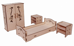 Спальня для кукол до 30см - отлично впишется в большой кукольный домик. Спальня собирается в 4 основных предмета: шкаф, кровать и 2 тумбочки. Открываются дверцы шкафа, имеются плечики и выдвижной ящик. Спальня придаст очарование, уют кукольному домику и станет полезной игрушкой для девочек. Поставляется в виде конструктора, в комплекте 40 деталей. Мебель для кукол изготовлена из березовой фанеры. Все предметы мебели молодая хозяйка может раскрасить по своему вкусу. Во время игры с кукольной мебелью у девочки развивается мышление, работает мелкая моторика, пространственное воображение и понимание причинно-следственных связей. Габаритные размеры предметов: шкаф 157x80x203мм, кровать 275x127x75мм, тумбочка 87x67x80мм.